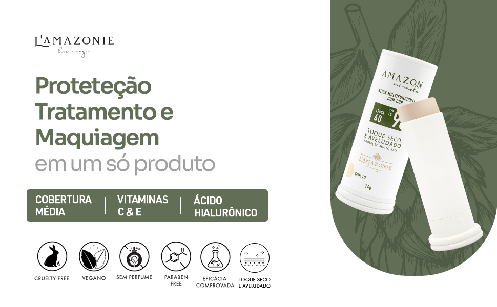 O bastão multifuncional com cor da L’Amazonie oferece cobertura média, longa duração e FPS 95 comFPUVA 40! Perfeito para todos os tipos de pele, suaviza manchas de acne e melasma e tem toque sequinho. Protege enquanto cuida da pele com Vitamina C, Vitamina E e Ácido Hialurônico.