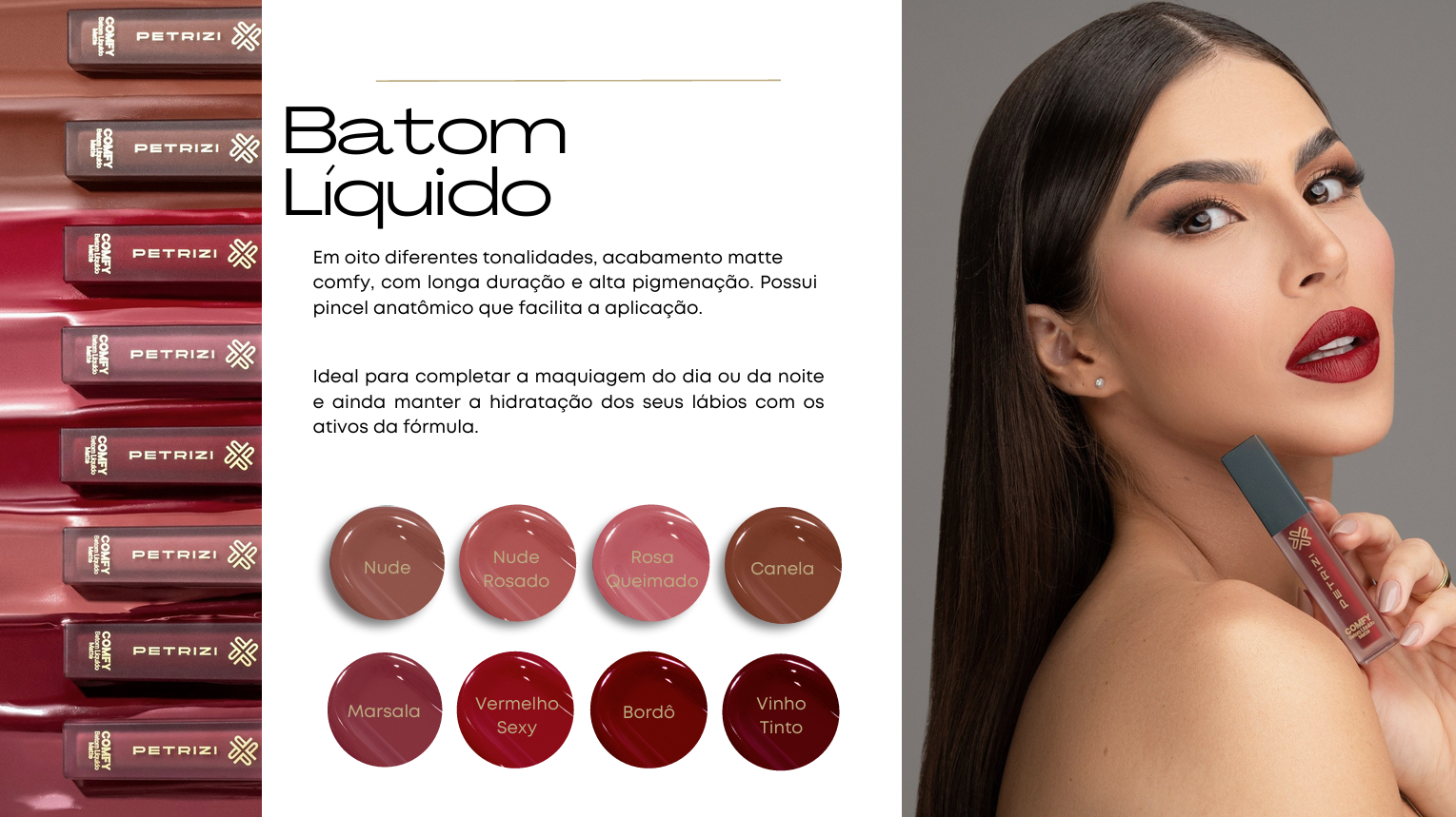 O Batom Líquido Matte Comfy está disponível em 8 diferentes tons com acabamento semi opaco confortável para você completar sua make com cores clássicas ou intensas nos lábios, sem se preocupar com a sensação de ressecamento. Sua fórmula é incrivelmente leve, desliza sem esforço, possibilita a construção de camadas para uma super pigmentação e é confortável para usar o dia ou a noite toda. Possui pincel anatômico projetado para tornar a aplicação mais simples, proporcionando uma cobertura precisa e impecável.