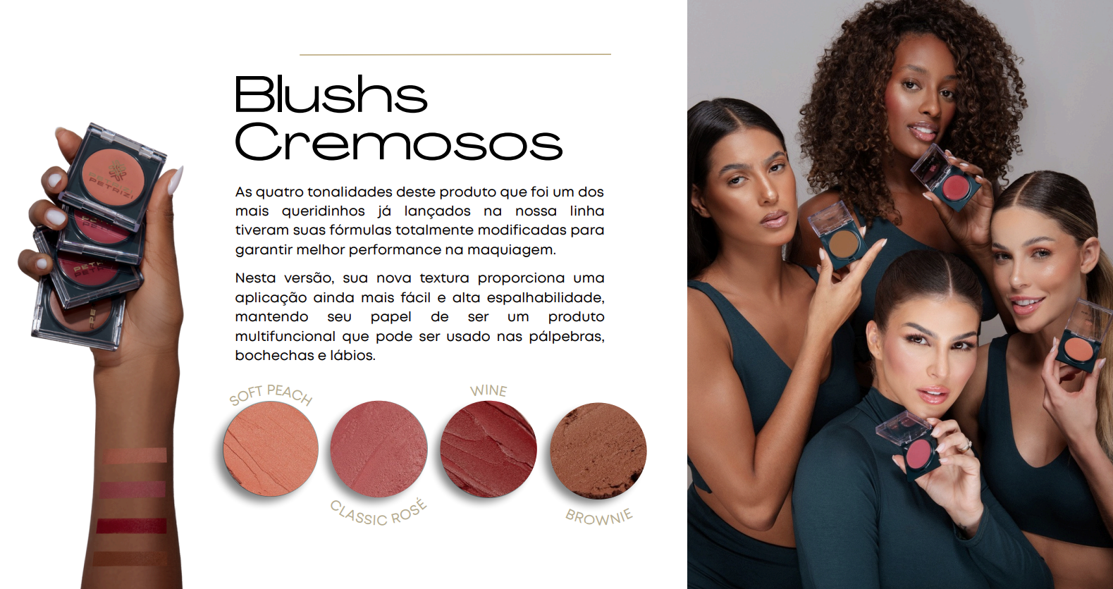 O Blush Cremoso possui uma textura cremosa, máxima hidratação e fácil aplicação. É um produto multifuncional e pode ser usado nas bochechas, lábios e pálpebras, além de ter a cor ideal para ser usado também como contorno para pontos estratégicos do rosto. Sua textura cremosa facilita ao esfumar, e promove um deslizar suave e uniforme. Totalmente reformulado e de cara nova. Pronto para realçar sua beleza como nunca antes.