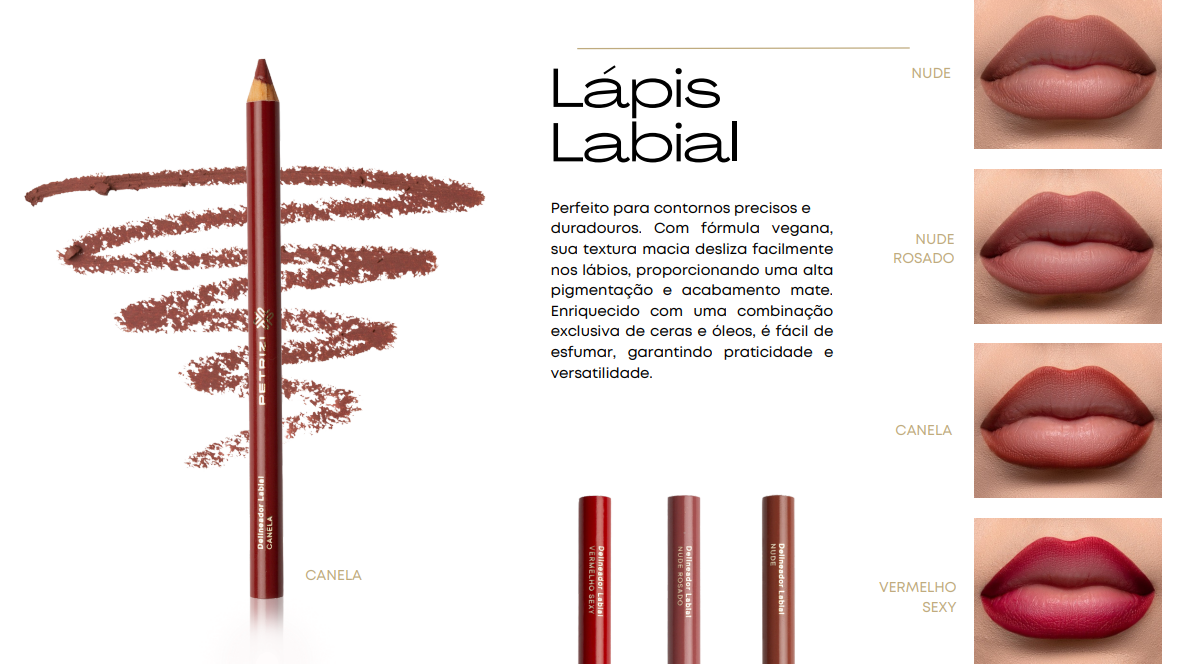 O Delineador Labial Petrizi é super pigmentado e desliza facilmente, contornando os lábios com um acabamento perfeito. Uma combinação altamente selecionada de ceras e óleos que fornece uma textura impecável e fácil de esfumar. Para uma aplicação mais precisa, utilize o lápis sempre apontado.