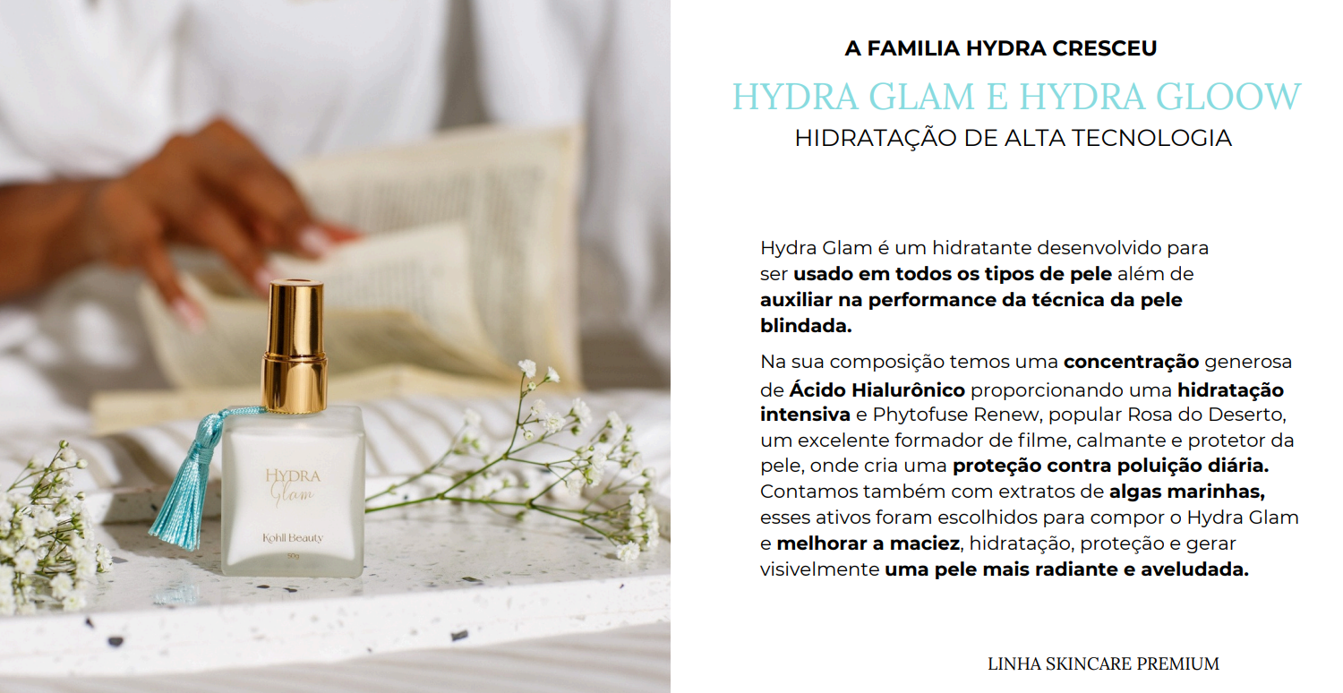 Uma pele saudável começa com hidratação profunda e proteção contra as agressões do dia a dia. O Hydra Glam da Kohll Beauty é um hidratante facial de alta performance, formulado para todos os tipos de pele e ideal para potencializar a performance da maquiagem resistente.