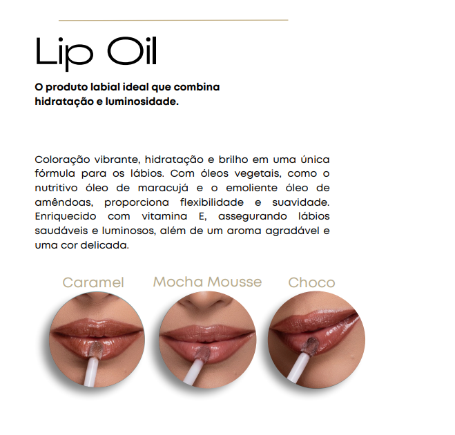 Dermatologicamente testado, hipoalergênico e não-irritante, o Lip Oil une tratamento e beleza: Hidrata profundamente, nutre com óleos e vitaminas e proporciona um brilho aos lábios.