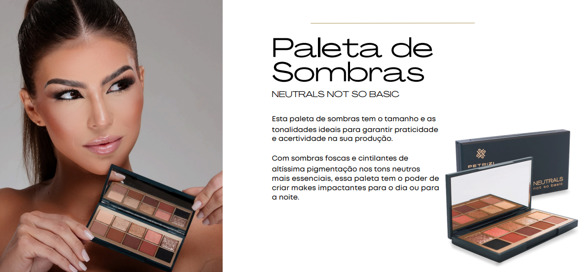 A paleta de sombras Petrizi mescla sombras foscas e cintilantes de altíssima pigmentação nos tons neutros mais essenciais para criar produções impactantes pro dia ou pra noite.