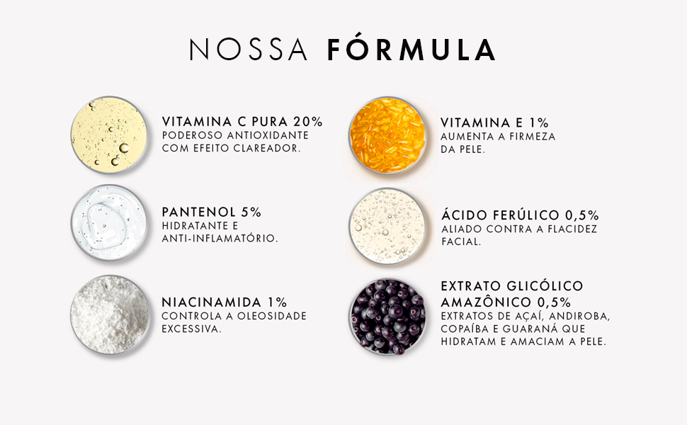 A combinação de Vitamina E e Ácido Ferúlico forma um escudo protetor contra os radicais livres, prevenindo os danos causados pelo ambiente e sinais de envelhecimento. Esses antioxidantes potentes não só ajudam a manter a firmeza da pele, mas também intensificam os efeitos clareadores, deixando a pele mais jovem e uniforme.